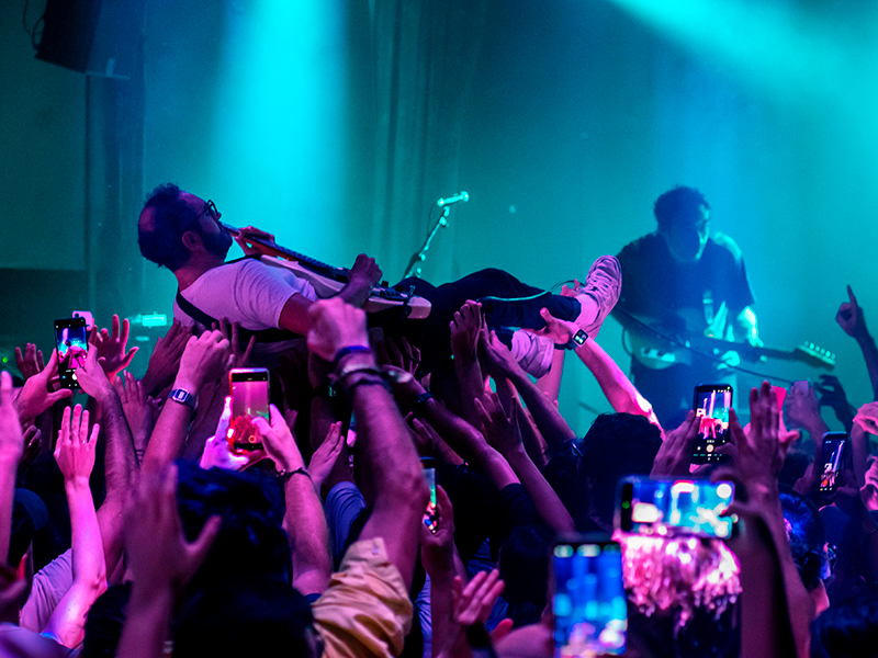Las sorpresas continuaron. En “Cardio” y “Caladas” irrumpió Diosito, de La Élite, para uno de los momentos más desquiciados de la noche: saltó al público, viaje en volandas y un estallido eléctrico que convirtió la sala en un caos. Después llegó “Aquellos ojos”, probablemente la pieza más histórica de Mujeres, clave en el proceso de transformación que desembocó en Un Sentimiento Importante. Curiosamente, apareció tres años antes del disco en un EP homónimo y mantiene intacta su fuerza: directo a la memoria, directo a la piel.
